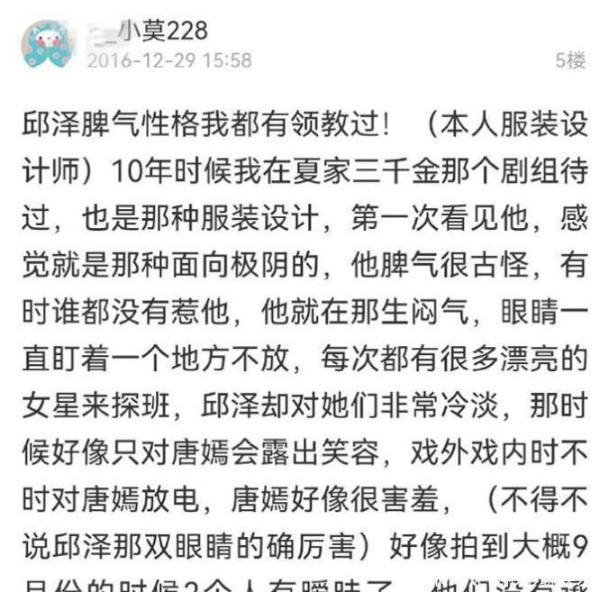 邱泽唐嫣过往邱泽和唐嫣之间的感情,算是一段年少时的青涩恋情,两人曾一起拍了《夏家三千金》以及不少偶像剧,难免会在戏里戏外都留下些情愫。有网友曝过,邱泽当年性格挺怪,中阴沉得很,但即便如此,唐嫣也是深深爱上了邱泽。