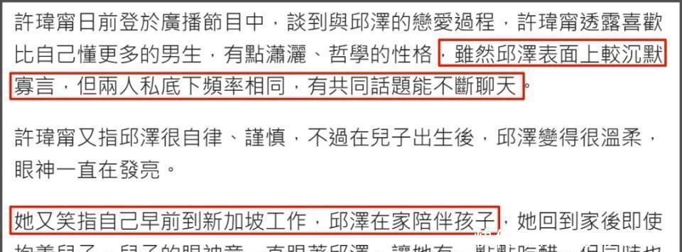 之前许玮甯在采访里聊过和邱泽平时相处的样子,大家都知道,两人相当默契,感情看起来是真的挺不错的。邱泽虽然平时看起来有点安静少言,但其实跟许玮甯总能聊得挺投机的,特别是在他们的小宝贝出生以后,邱泽变得更加温柔体贴,细心又有耐心。